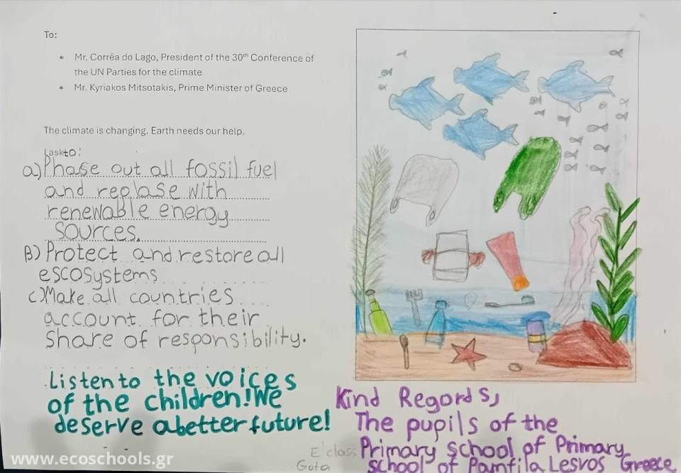 Λίγες ημέρες πριν από τη Διάσκεψη του ΟΗΕ για το Κλίμα (COP30) στο Belém της Βραζιλίας, αντιπροσωπεία μαθητών/μαθητριών συναντήθηκαν με τον Υπουργό Περιβάλλοντος και Ενέργειας, κ. Σταύρο Παπασταύρου και τον Πρέσβη της Βραζιλίας στην Ελλάδα, κ. Paulo Roberto Caminha de Castilhos França, προκειμένου να τους παραδώσουν περισσότερες από 5.600 επιστολές, ζωγραφιές και κάρτες μαθητών και μαθητριών από 249 σχολεία από όλη την Ελλάδα που ζητούν γενναία μέτρα για την αντιμετώπιση της κλιματικής κρίσης.