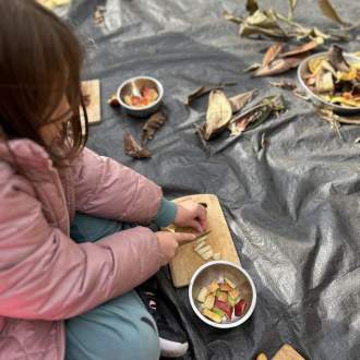 Στον παιδικό μας σταθμό, τα παιδιά μαθαίνουν τι υλικά είναι κατάλληλα για κομποστοποίηση. Συλλέγουμε φύλλα και φλούδες, τα κόβουμε με ασφάλεια στο ξύλο κοπής και τα τοποθετούμε στον κάδο κομπόστ.