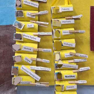Το παρουσιολόγιο της τάξης μας δημιουργήθηκε με ανακυκλώσιμα υλικά και η γωνιά της γραφής οργανώθηκε επίσης με ανακυκλώσιμα υλικά όπως άδεια κουτιά από τσιγάρα και καπάκια από συσκευασίες γάλατος
