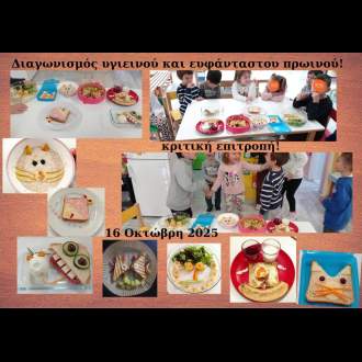 Μαθαίνουμε να τρώμε υγιεινά! Στο σχολείο μας η υγιεινή διατροφή παίζει σημαντικό ρόλο! Οι γονείς των παιδιών είναι αρωγοί στην προσπάθειά μας αυτή! Με αφορμή την Παγκόσμια Ημέρα Διατροφής διοργανώσαμε Διαγωνισμό για το καλύτερο Υγιεινό και Ευφάνταστο πρωινό! Οι μητέρες των μαθητών και μαθητριών μας δημιούργησαν με πολλή αγάπη υγιεινά και ευφάνταστα πιάτα με τη βοήθεια των παιδιών. Η κριτική επιτροπή η οποία αποτελούνταν από τους μικρούς μαθητές και μαθήτριες επέλεξε το καλύτερο πιάτο και παρέδωσε το βραβείο