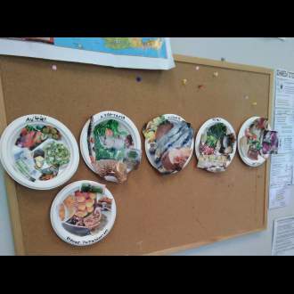 Οι μαθητές της Β'ταξης ξεφύλλισαν από περιοδικά εικόνες τροφών που θεώρησαν υγιεινές, όπως φρούτα, λαχανικά, δημητριακά ολικής αλέσεως, γαλακτοκομικά και πρωτεΐνες..Εκοψαν τις εικόνες και ο καθένας έκανε το δικό του "πιάτο υγιεινής διατροφής".