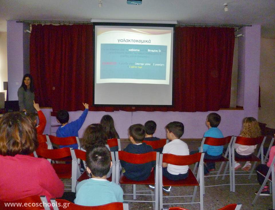 Στο πλαίσιο του προγράμματος των Οικολογικών Σχολείων με θέμα «Ποιότητα ζωής - Διατροφή», επισκέφτηκε το σχολείο μας η διαιτολόγος - διατροφολόγος κ. Μπαντερμά Ιωάννα, προκειμένου να ενημερώσει τους μαθητές της Α΄ Τάξης για τη διατροφική πυραμίδα, την αξία του πρωινού και τη σωστή διατροφή.