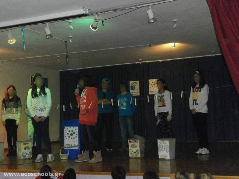 Από την προηγούμενη ημέρα οι μαθητές της Α΄ τάξης είχαν μαζέψει τις συσκευασίες από το πρωινό των μαθητών που θα κατέληγαν στο τέλος του διαλείμματος στα σκουπίδια. Αυτά τοποθετήθηκαν σε καλάθι πάνω στη σκηνή και σε ένα άλλο καλάθι υπήρχαν τα μανταλάκια για το άπλωμα της «μπουγάδας». Οι μαθητές της Ε΄ τάξης είχαν κατασκευάσει τέσσερις κάδους ανακύκλωσης από έναν για κάθε ανακυκλώσιμο υλικό, για το χαρτί, το αλουμίνιο, το πλαστικό και το γυαλί που κι αυτά αποτέλεσαν μέρος του σκηνικού. Ένα σκοινί ήταν απλωμένο και στηριγμένο στις δύο κολόνες της σκηνής. Με τη συνοδεία ενός πολύ χαρούμενου τραγουδιού οι μαθητές της Β΄ τάξης άπλωσαν στο σκοινί τις συσκευασίες-απορρίμματα. Ακολούθησε το παιχνίδι «Ξε–διαλέγω – χαρί–ΖΩ» από τους μαθητές της Στ΄ τάξης οι οποίοι δίνοντας το σύνθημα «Καθαρή αυλή – καθαρό περιβάλλον» έκαναν το ξεκαθάρισμα των απορριμμάτων που είχαν απλωθεί στο σκοινί της μπουγάδας. Το παιχνίδι συνοδευόταν από χορό και τραγούδι σε ρυθμό ραπ ώσπου όλη η… «μπουγάδα των απορριμμάτων» διαμοιράστηκε από το σκοινί στους αντίστοιχους κάδους ανακύκλωσης.