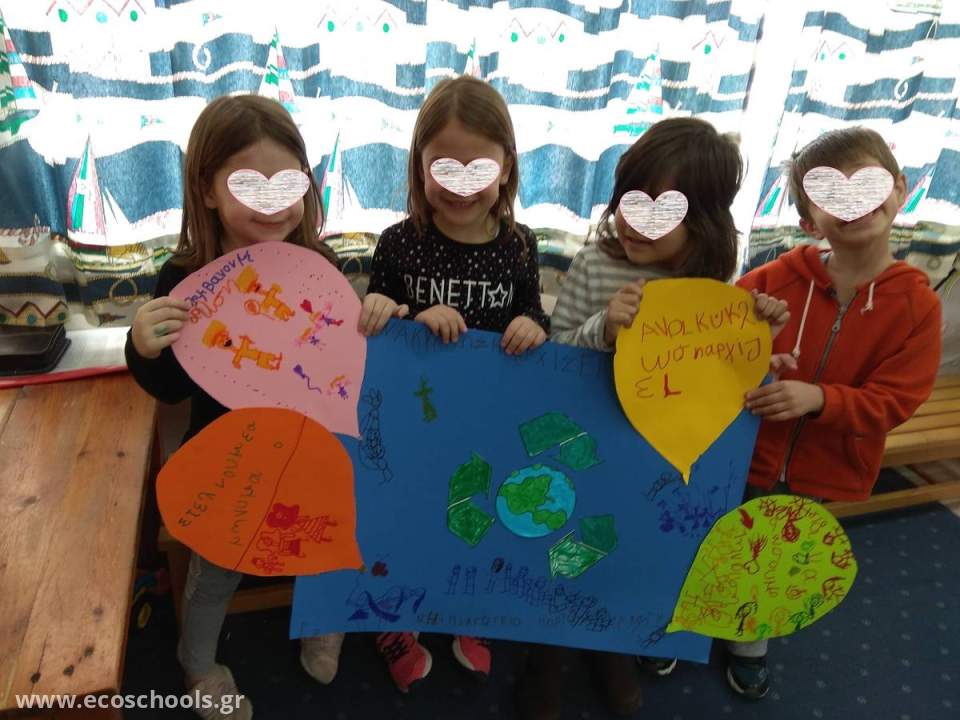Τα παιδιά δημιούργησαν αφίσα για τη διάδοση του μηνύματος της υπεύθυνης διαχείρισης των απορριμμάτων. Έγραψαν: 1. Στέλνουμε μήνυμα, 2. Αναλαμβάνουμε δράση, 3. Ανακύκλωση αρχίζει και 4. Να σώσουμε τη φύση. Ζωγράφισαν τις ιδέες τους, χρωμάτισαν τη γη και το σήμα της ανακύκωσης, τα έκοψαν και τα κόλλησαν.
