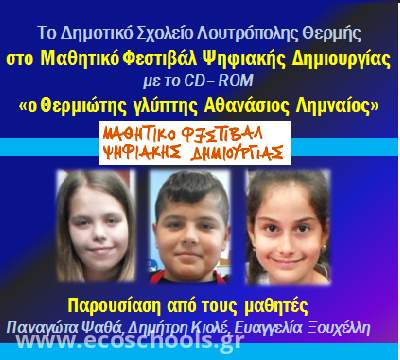 > To Δημοτικό μας Σχολείο παρουσίασε το CD-ROM για τη ζωή και το έργο του Θερμιώτη γλύπτη Αθ. Λημναίου, που το ομορφότερο έργο του στη Λέσβο είναι το άγαλμα της Σαπφούς στην ομώνυμη πλατεία της Μυτιλήνης. Η παρουσίαση έγινε από τρεις μαθητές της Δ΄τάξης, που καταχειροκροτήθηκαν από το ακροατήριο την Παναγιώτα Ψαθά, την Ευαγγελία Ξουχέλλη και τον Δημήτρη Κιολέ. Ήταν η δεύτερη χρονιά που το Σχολείο μας συμμέχει σε παρόμοια διοργάνωση. Πέρυσι παρουσίασε το CD-ROM «Το φαράγγι της Θερμής και τα σπήλαιά του».