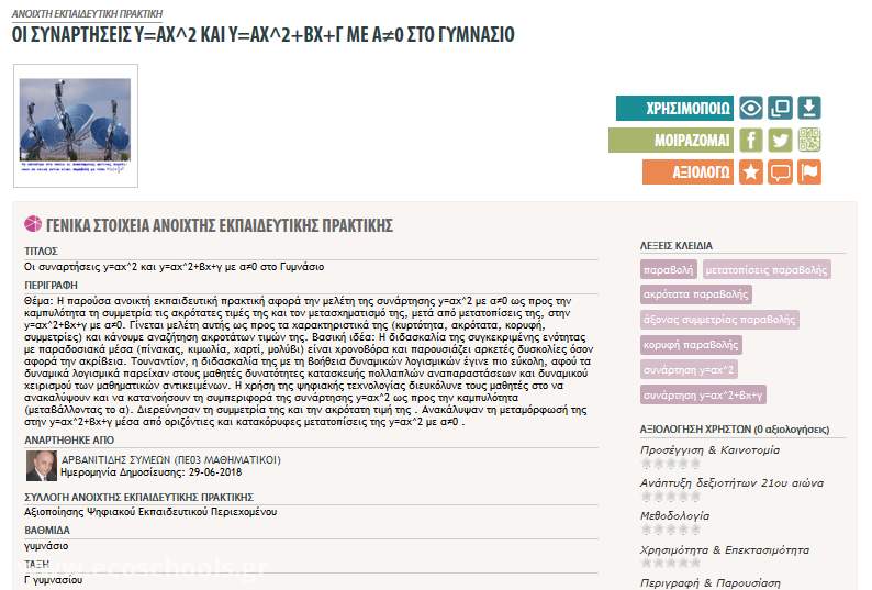 - ΑΝΟΙΧΤΗ ΕΚΠΑΙΔΕΥΤΙΚΗ ΠΡΑΚΤΙΚΗ: Οι συναρτήσεις y=αx2 και y=αx2+βx+γ με α≠0 στο γυμνάσιο http://photodentro.edu.gr/oep/r/8532/635?locale=el