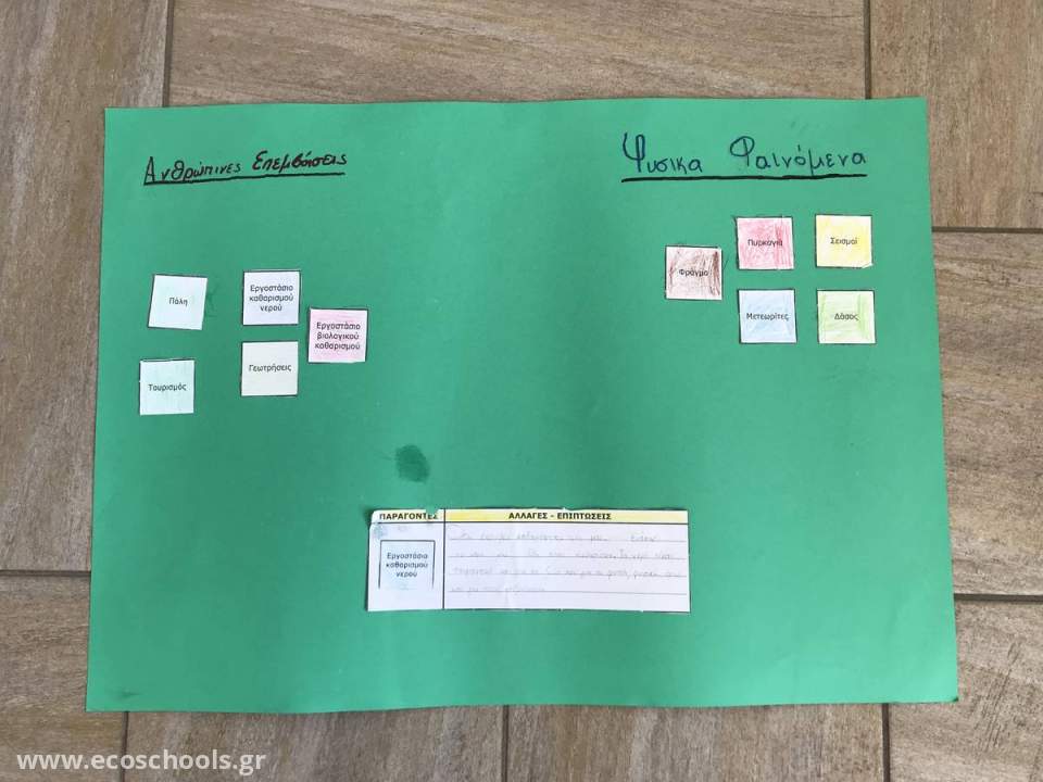 - Τέλος, η πέμπτη ομάδα μαθητών ασχολήθηκε με τις ανθρώπινες επεμβάσεις αλλά και τα φυσικά φαινόμενα που αφορούν το Νερό. Κλήθηκαν να ταξινομήσουν στις κατηγορίες που προαναφέρθηκαν καρτέλες με λέξεις που αφορούν το Νερό, τόσο ταξινομώντας τες στην κατηγορία «ανθρώπινες επεμβάσεις», όσο και στην κατηγορία «Φυσικά φαινόμενα» . Τέλος, επέλεξαν να αναλύσουν περαιτέρω κάθε παράγοντα, επιχειρηματολογώντας σχετικά με τις επιπτώσεις και τις αλλαγές που θα φέρει στην καθημερινότητα.