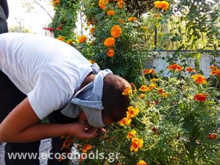 Αρχικά κάναμε περίπατο μέσα στον κήπο μας και αγγίξαμε, μυρίσαμε και θυμηθήκαμε το όνομα των φυτών μας. Στη συνέχεια, αφού κλείσαμε τα μάτια μας, οδηγούμασταν από την Υπεύθυνη του Προγράμματος σε κάθε φυτό και καλούμασταν να το αναγνωρίσουμε., Στη συνέχεια δουλέψαμε σχετικό φύλλο εργασίας για αυτή την δραστηριότητα.