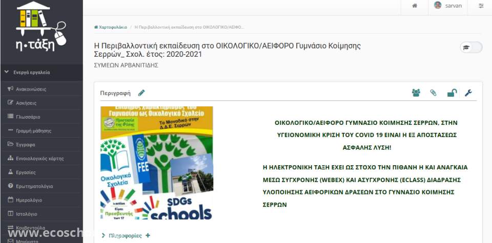 Ανοικτό μάθημα στην πλατφόρμα eclass με τίτλο:Η Περιβαλλοντική εκπαίδευση στο ΟΙΚΟΛΟΓΙΚΟ/AEIΦΟΡΟ Γυμνάσιο Κοίμησης Σερρών_ Σχολ. έτος: 2020-2021