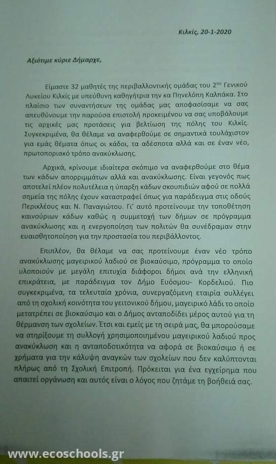 Στο πλαίσιο του προγράμματος περιβαλλοντικής εκπαίδευσης που υλοποιείται στο σχολείο μας τη σχολική χρονιά 2019-2020 "Δρω για το περιβάλλον", οι μαθητές της περιβαλλοντικής ομάδας συνέταξαν επιστολή με διάφορα αιτήματα που άπτονται περιβαλλοντικών ζητημάτων της πόλης μας. Στη συνέχεια σύσσωμη η περιβαλλοντική ομάδα ( 32 μαθητές ) επισκέφτηκε τον Δήμαρχο Κιλκίς όπου και παραμείνε στο γραφείο του για μια ώρα συζητώντας για τα θέματα της επιστολής. Επισυνάπτονται η επιστολή των μαθητών, φωτογραφίες από την επίσκεψη και το ΔΤ που στάλθηκε στα τοπικά έντυπα και ηλεκτρονικά μέσα της πόλης μας.