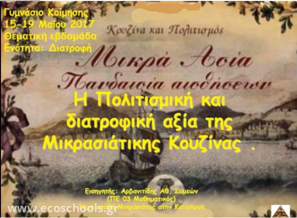 2. Βίντεο με θέμα: «Η πολιτισμική και η διατροφική αξία της Μικρασιάτικης Κουζίνας». Υλοποιήθηκε με συντονιστή τον ΑΡΒΑΝΙΤΙΔΗ ΣΥΜΕΩΝ Μαθηματικό του Γυμνασίου Κοίμησης Σερρών (Τύχη Αγαθή Μικρασιάτη στην Καταγωγή) στα πλαίσια της θεματικής εβδομάδας 2017-2018