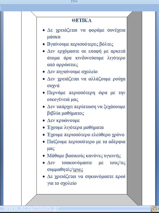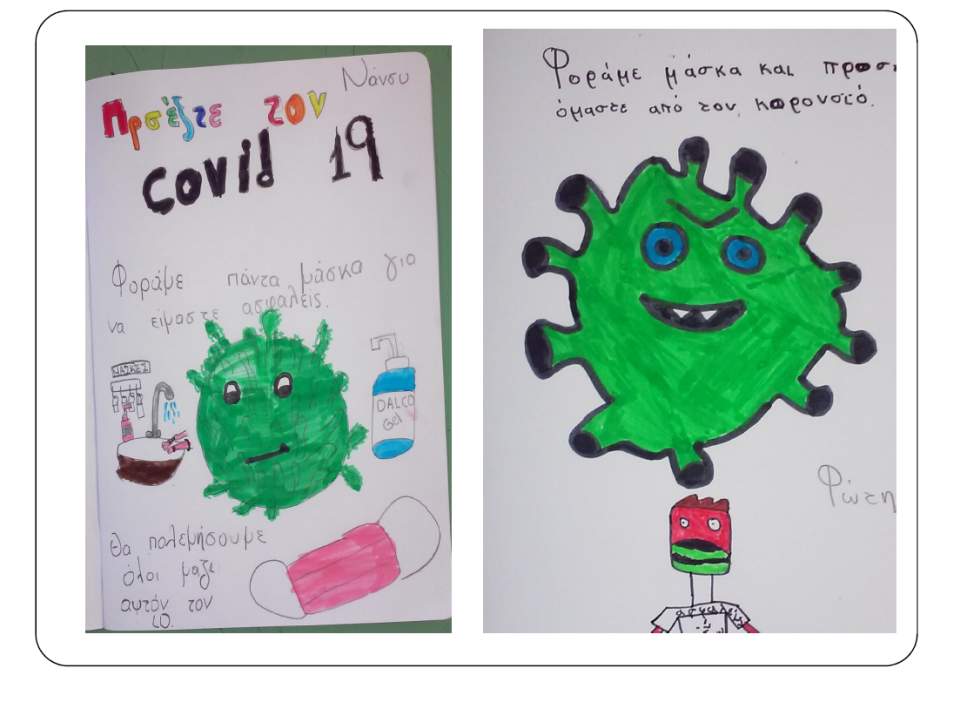 Η πανδημία, πρώτα απ' όλα, έγινε αφορμή να μελετηθούν εκ νέου οι κανόνες υγιεινής που διασφαλίζουν την προστασία της σωματικής μας υγείας. Στο σχολείο μας, όπως σε όλα τα εκπαιδευτικά ιδρύματα της χώρας μας, μεριμνήσαμε ώστε να εφαρμόζονται τα μέτρα υγιεινής από όλους (εκπαιδευτικούς και λοιπό προσωπικό, μαθητές, γονείς). Δόθηκε επιπλέον έμφαση στη συμμετοχή των μαθητών για την κατανόηση της αναγκαιότητας τήρησης των μέτρων. Έτσι, ήδη με το ξεκίνημα της σχολικής χρονιάς, οι μαθητές/τριες του Δ'2 τμήματος δημιούργησαν μια παρουσίαση με τίτλο "Γιατί πρέπει να φοράμε μάσκα στην τάξη;", που μοιράστηκαν με τους συμμαθητές τους και στην οποία με ευφάνταστο και δημιουργικό τρόπο εξηγούσαν την αναγκαιότητα της χρήσης της μάσκας στο σχολείο (http://1dim-glykon.att.sch.gr/index.php/contact/118-evropaika-programmat...).