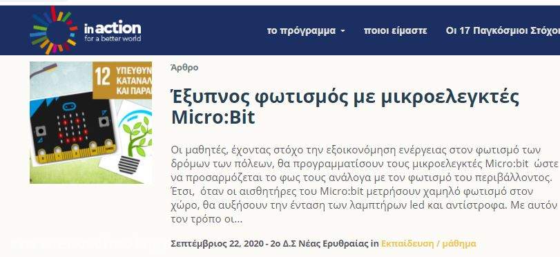 Οι μαθητές, έχοντας στόχο την εξοικονόμηση ενέργειας στον φωτισμό των δρόμων των πόλεων, θα προγραμματίσουν τους μικροελεγκτές Micro:bit ώστε να προσαρμόζεται το φως τους ανάλογα με τον φωτισμό του περιβάλλοντος. Έτσι, όταν οι αισθητήρες του Micro:bit μετρήσουν χαμηλό φωτισμό στον χώρο, θα αυξήσουν την ένταση των λαμπτήρων led και αντίστροφα.