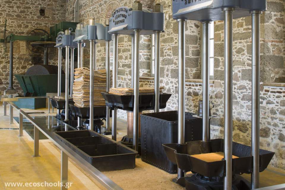 # Στους μαθητές των μεγάλων τάξεων εξηγήθηκε το πώς δούλευαν παλιά τα ατμοκίνητα ελαιοτριβεία με τον ελαιοπολτό, να μπαίνει στους ελαιόσακκους και να πιέζεται στα μπασκιά , απ΄ όπου έτρεχε το λάδι.