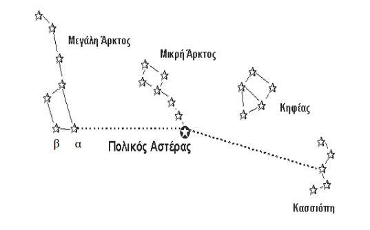 Για να προσανατολιστούμε το βράδυ, αρκεί να βρούμε τον Πολικό Αστέρα ο οποίος δείχνει πάντα το Βορρά. Ο Πολικός Αστέρας έχει το προνόμιο να μην αλλάζει θέση όπως όλα τα άλλα αστέρια, τα οποία ανάλογα με την εποχή που τα παρατηρούμε, τα βλέπουμε και σε διαφορετική θέση. Αυτό γίνεται, διότι ο Πολικός Αστέρας βρίσκεται πάνω στον άξονα περιστροφής της Γης . Η θέση του προσδιορίζεται εύκολα από τον αστερισμό της Μεγάλης Άρκτου. Η Μεγάλη Άρκτος βρίσκεται πάντα στο βόρειο τμήμα του ορίζοντα και αναγνωρίζεται εύκολα από το σχήμα κατσαρόλας που σχηματίζουν τα επτά άστρα της. Αν από τα άστρα α και β της Μεγάλης Άρκτου χαράξουμε μια νοητή γραμμή και την προεκτείνουμε προς το α, 5 φορές το μήκος α-β, τότε θα βρούμε τον πολικό αστέρα που ανήκει στον αστερισμό της Μικρής Άρκτου (δείτε την επισυναπτόμενη φωτογραφία).