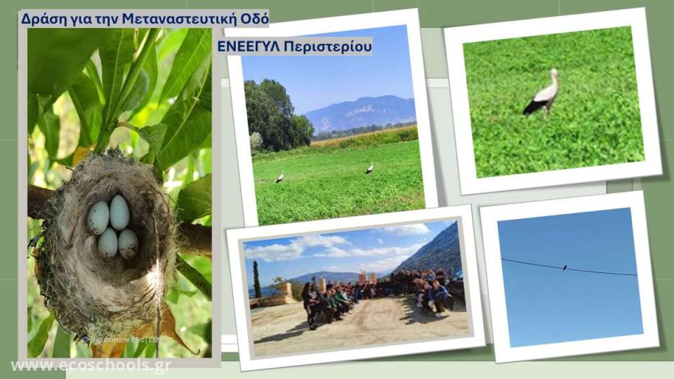 Μόλις μια μέρα πριν το κλείσιμο των σχολείων για Πάσχα. Αποφασίσαμε να πάμε μια εκπαιδευτική εκδρομή με τους μαθητές μας στο Ν. Κορινθίας, έτσι ώστε να αναζητήσουμε και να μελετήσουμε τα αποδημητικά πουλιά. Η χαρά των μαθητών ήταν απερίγραπτη, αφού τους δόθηκε η δυνατότητα από το τσιμέντο της πόλης να έρθουν σε επαφή με το πράσινο της φύσης, την βλάστηση, το νερό, τα βουνά και το οικοσύστημα της περιοχής. Εκεί μας δόθηκε η δυνατότητα να συλλέξουμε πολύτιμες πληροφορίες μέσω παρατήρησης και φωτογράφισης των φτερωτών φίλων μας (πελαργοί, χελιδόνια), ενώ εξερευνήσαμε και φωλιές άλλων σπάνιων πουλιών. Η εμπειρία αυτή μας βοήθησε να κατανοήσουμε καλύτερα τη σημασία της προστασίας των αποδημητικών πουλιών και του φυσικού περιβάλλοντος.