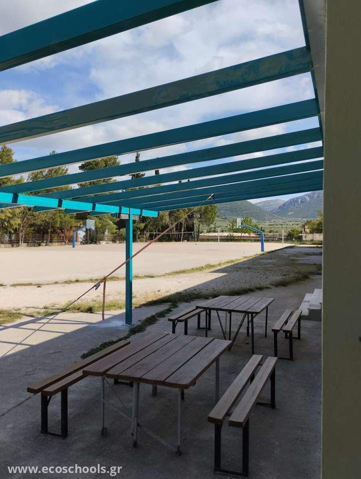 Το αίτημα της Περιβαλλοντικής επιτροπής περιλάμβανε την τοποθέτηση δύο στεγάστρων στα προαύλιά μας, και είναι ένα αίτημα ετών, που, επιτέλους, έγινε φέτος πραγματικότητα.