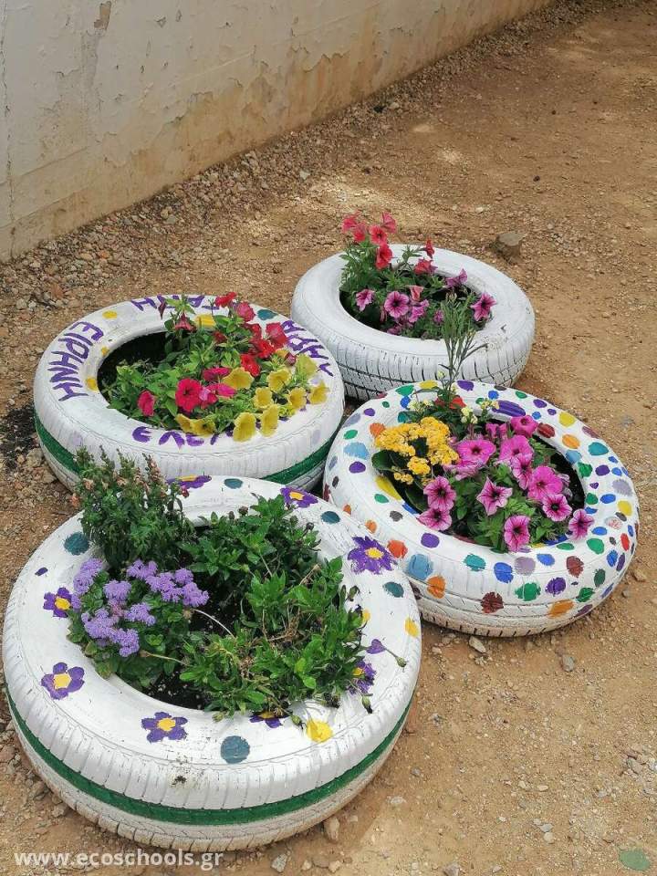 Οι μαθητές και οι μαθήτριες του 1ου Γυμνασίου Βριλησσίων έβαψαν παλιά λάστιχα αυτοκινήτων και δημιούργησαν με αυτά περίτεχνες γλάστρες στις οποίες φύτεψαν ανοιξιάτικα λουλούδια και αρωματικά φυτά, τα οποία βέβαια δεν παραλείπουν να ποτίζουν. Έφτιαξαν έτσι μια όμορφη γωνιά στην αυλή του σχολείου γεμάτη αρώματα και χρώματα!