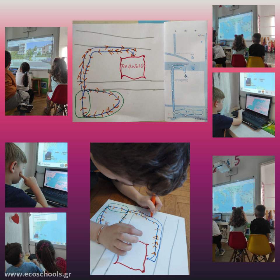 Επιστρέφοντας στην τάξη, ξεκινήσαμε να μιλάμε για την διαδρομή, την οποία είδαμε στο στίγμα που καταγράψαμε με το κινητό τηλέφωνο της δασκάλας μας και συνεχίσαμε αποτυπώνοντας την με ένα γραμμικό σχέδιο στο χαρτί μας χρησιμοποιώντας βελάκια για να δείξουμε τις αντίστοιχες κατευθύνσεις.