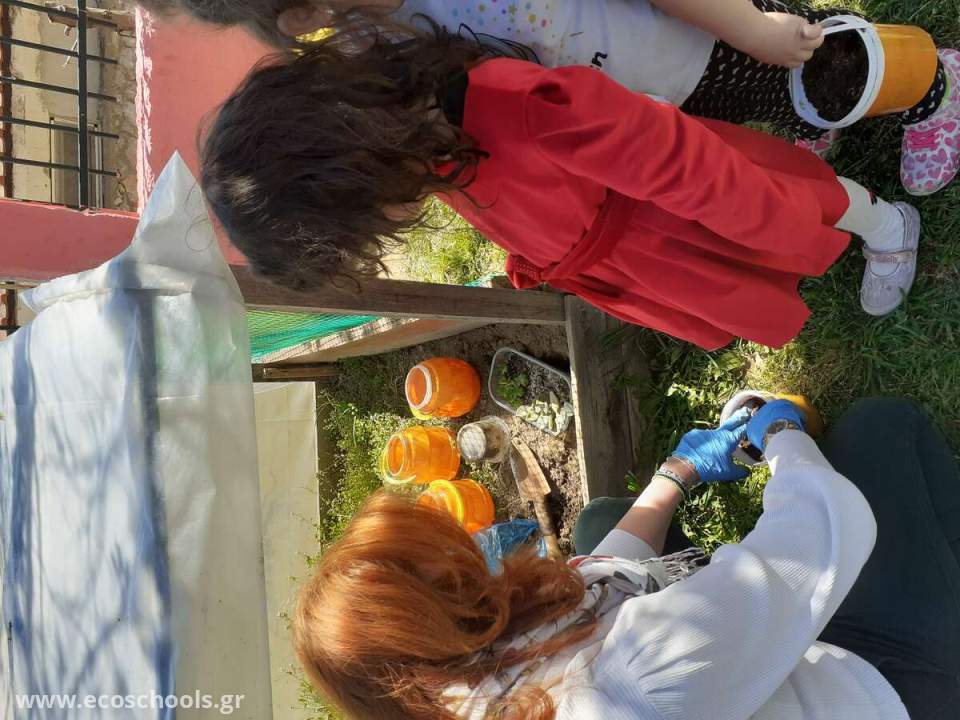 Βάψαμε μεγάλα κεσεδάκια από γιαούρτι που μας έφεραν οι γονείς και φτιάξαμε τις δικές μας γλάστρες για να στολίσουμε την αυλή μας με τα φυτά μας.