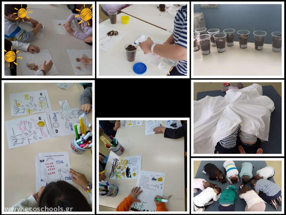 Το φθινόπωρο οι αγρότες οργώνουν και σπέρνουν τα χωράφια τους. Εικόνες οικείες για τα περισσότερα παιδιά του σχολείου μας. Παρακολουθήσαμε όλοι μαζί ένα σχετικό βίντεο για το όργωμα και τη σπορά. Στη συνέχεια καθίσαμε στα τραπεζάκια και παρατηρήσαμε διάφορους σπόρους. Δώσαμε προσοχή στο μέγεθος και στο σχήμα τους. Ακούσαμε ακόμη και τον ήχο που παράγουν τοποθετώντας τα σε μικρά κουτάκια και κουνώντας τα. Άλλον ήχο κάνει το σιτάρι άλλον τα ρεβύθια. Φυτέψαμε όποιον σπόρο θέλαμε και συζητήσαμε τι χρειάζονται τα σποράκια για να μεγαλώσουν. Καταγράψαμε σε φύλλο εργασίας οτι χρειάζεται ένα φυτό για να μεγαλώσει. Επίσης ζωγραφίσαμε το ποίημα το μικρό σποράκι. Τα παιδιά έγιναν σποράκια που κρύβονται μέσα στο χώμα και μεγαλώνουν σιγά σιγά με την βοήθεια του ήλιου του νερού και του αέρα.