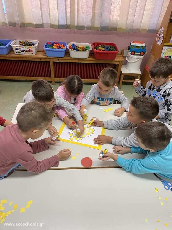 Στην τέχνη, δημιουργήσαμε ψηφιδωτά λεμόνια με χαρτάκια και γεμίσαμε την τάξη με φως και χρώμα.
