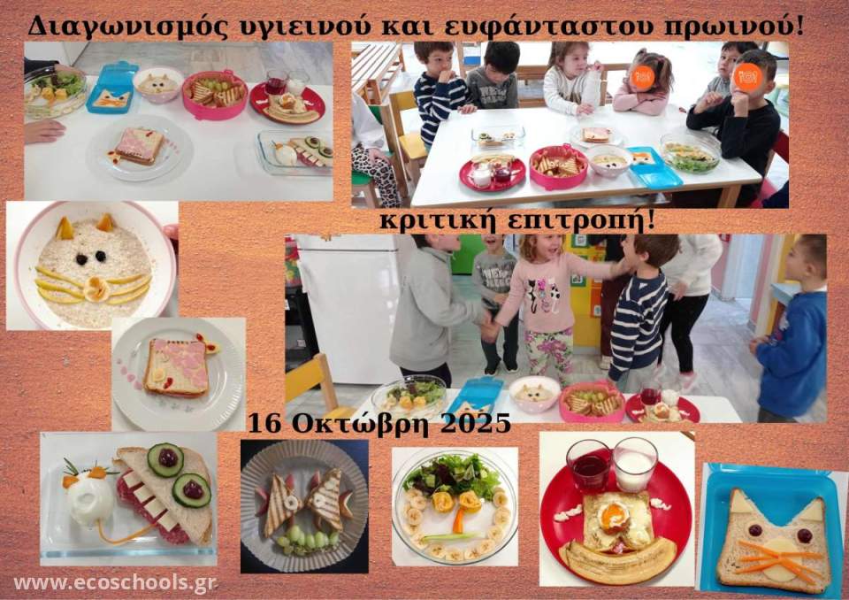 Μαθαίνουμε να τρώμε υγιεινά!  Στο  σχολείο μας η υγιεινή διατροφή παίζει σημαντικό ρόλο! Οι γονείς των παιδιών είναι αρωγοί στην προσπάθειά μας αυτή! Με αφορμή την Παγκόσμια Ημέρα Διατροφής διοργανώσαμε Διαγωνισμό για το καλύτερο Υγιεινό και Ευφάνταστο πρωινό! Οι μητέρες των μαθητών και μαθητριών μας δημιούργησαν με πολλή αγάπη υγιεινά και ευφάνταστα πιάτα με τη βοήθεια των παιδιών. Η κριτική επιτροπή η οποία αποτελούνταν από τους μικρούς μαθητές και μαθήτριες  επέλεξε το καλύτερο πιάτο και παρέδωσε το βραβείο