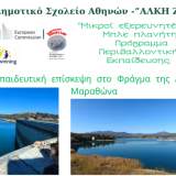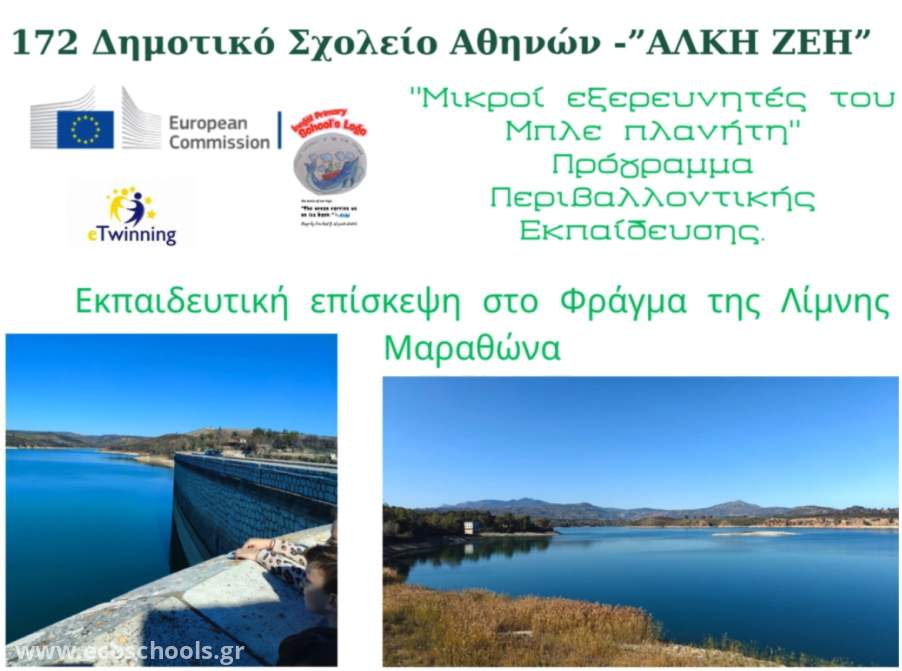 Οι μαθητές του 172ου Δημοτικού Σχολείου Αθηνών επισκέφθηκαν τη Λίμνη Μαραθώνα. Εκεί είδαμε το φράγμα μιλήσαμε για την ορθή  διαχείριση του νερού της λίμνης που υδροδοτεί την Αθήνα, το φαινόμενο της λειψυδρίας, την υδροηλεκτρική ενέργεια και πώς μπορούμε να χρησιμοποιήσουμε μικρές πηγές νερού για την παραγωγή ηλεκτρικής ενέργειας. Αφού ακούσαμε μερικές πληροφορίες για τη λίμνη και την κατασκευή του φράγματος, παίξαμε παιχνίδια – προσομοιώσεις των χειρονακτικών εργασιών των εργατών. Στη συνέχεια, πήραμε σακούλες και καθαρίσαμε την περιοχή από τα σκουπίδια για να ενισχύσουμε την περιβαλλοντική μας συνείδηση.