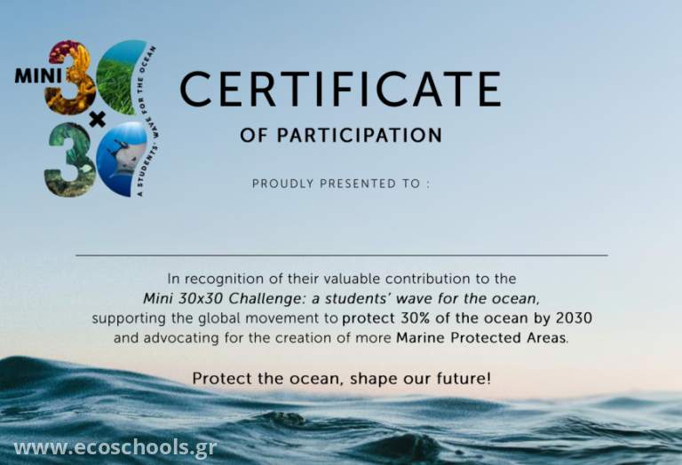 “Η μίνι πρόκληση 30×30 – Το κύμα ενός μαθητή για τον ωκεανό είναι ένα παγκόσμιο κίνημα που ενδυναμώνει τους μαθητές να υπερασπιστούν την προστασία των ωκεανών, ενθαρρύνοντας μια ισχυρότερη δέσμευση των κρατών μελών του ΟΗΕ για την προστασία του 30% των ωκεανών έως το 2030.”
