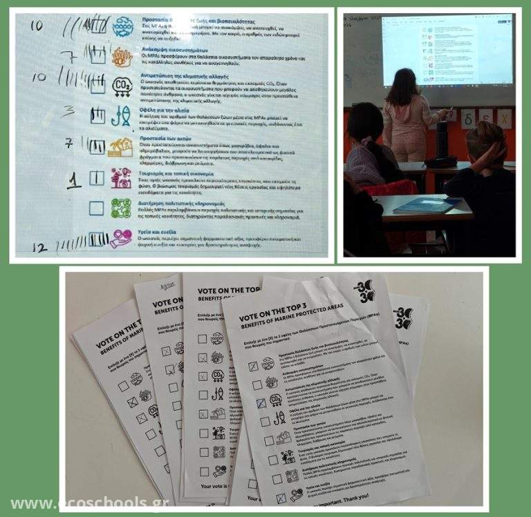 Η Ε’ τάξη, με τη σειρά της κι έπειτα από ψηφοφορία των μαθητών, κατέγραψε τις ψήφους και κατέληξε στο συμπέρασμα πως τα 3 σημαντικότερα οφέλη των Θαλάσσιων Προστατευόμενων Περιοχών είναι: