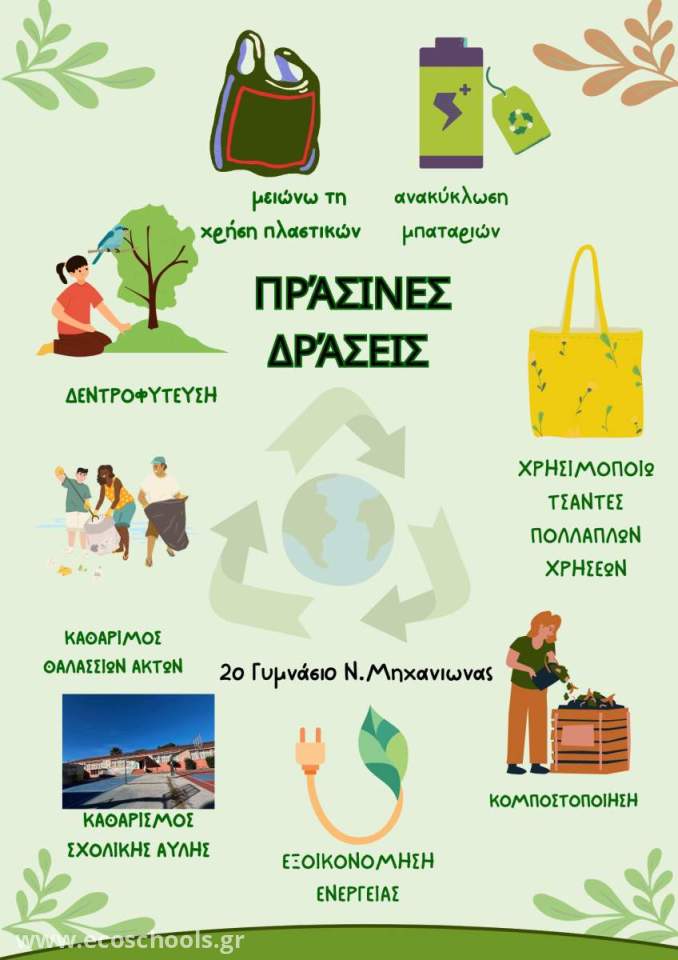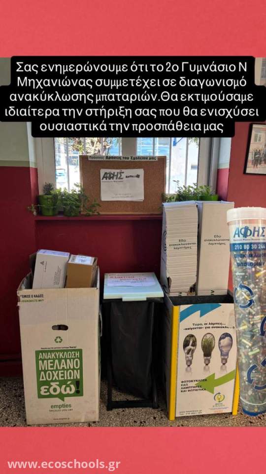 Το περιβαλλοντικό πρόγραμμα του σχολείου μας με τίτλο: “Πράσινες Δράσεις -Καθαρό Μέλλον!” ξεκίνησε την 1η δράση για φέτος που αφορά την εξοικονόμηση ενέργειας.Οι μαθητές/τριες συμμετέχουν σε διαγωνισμό ανακύκλωσης μπαταριών.