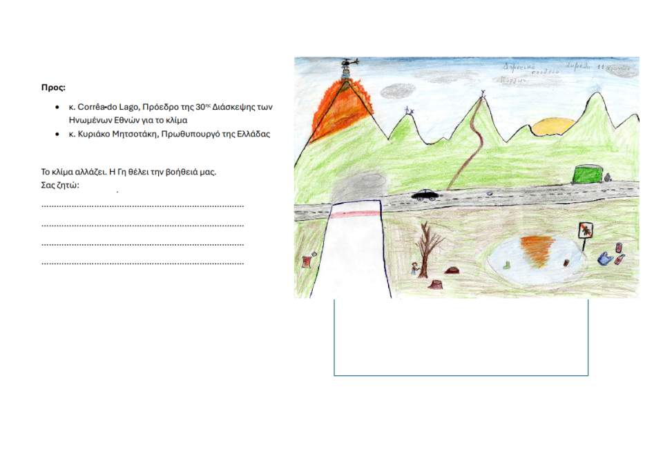 Οι μικροί μας μαθητές/τριες, ενημερωμένοι για τις επιπτώσεις της κλιματικής αλλαγής, δημιούργησαν τις δικές τους ξεχωριστές επιστολές/κάρτες με ζωγραφιές και απλά λόγια.