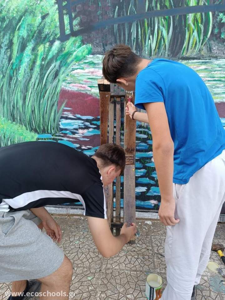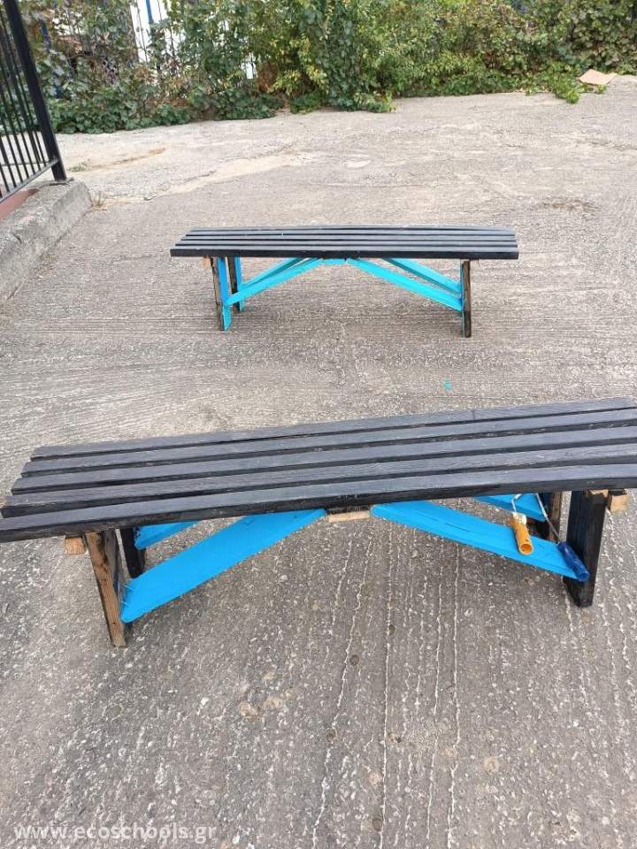 • Κατασκευάστηκαν 2 παγκάκια για χρήση στον αύλιο χώρο, ανακυκλώνοντας παλέτες που περισσέψαν από τη διανομή των σχολικών βιβλίων του προηγούμενου έτους. Στην κατασκευή συμμετείχαν ενεργά, υπό την παρακολουθηση και τις οδηγίες εκπαιδευτικών, μαθητές από την Β' και Γ' τάξη.