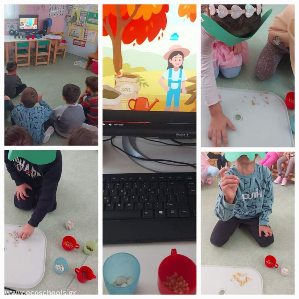 Αρχικά, τα παιδιά γνώρισαν τους σπόρους και τη διαδικασία της σποράς. Παρατήρησαν πραγματικούς σπόρους, είδαν σχετικό βίντεο και με τη χρήση της αφή μάντεψαν ποιοι σπόροι ανήκουν σε ποιο φυτό. Συζητήσαμε για το πώς μεγαλώνουν τα φυτά, τι χρειάζονται για να αναπτυχθούν και πώς καλλιεργείται ένα χωράφι.