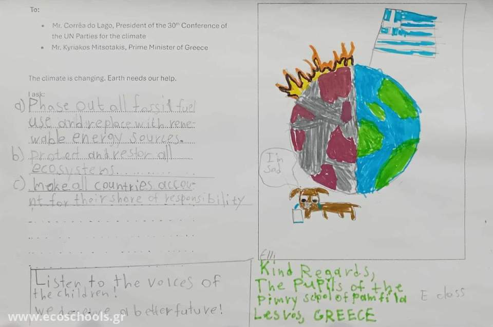 Οι μαθητές/τριες δημιούργησαν μια επιστολή- κάρτα με τα αιτήματά τους που απευθύνεται στον πρωθυπουργό της Ελλάδας, που θα εκπροσωπήσει τη χώρα μας, και στον πρόεδρο της COP, Mr Correa do Logo .