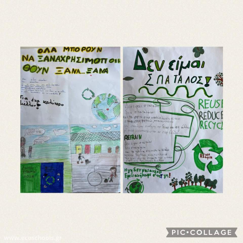 Στα πλαίσια του Προγράμματος 'Οικολογικά Σχολεία" οι μαθητές/ τριες του Ε'1 τμήματος ασχολήθηκαν με τους τρόπους που μπορούμε να σώσουμε τον πλανήτη μας με το να μην είμαστε σπάταλοι. Για τον λόγο αυτό τα παιδιά χωρίστηκαν σε ομάδες και δημιούργησαν αφίσες για τους συμμαθητές του σχολείου μας με σκοπό να βοηθήσουν και άλλα παιδιά να μην είναι σπάταλα και να σεβαστούν τους φυσικούς πόρους που δυστυχώς τα τελευταία χρόνια λιγοστεύουν ολοένα και περισσότερο.