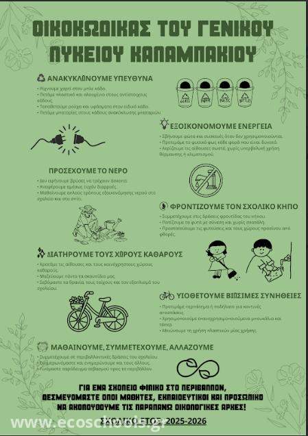 Οι μαθητές, σε συνεργασία με τους εκπαιδευτικούς τους, δημιούργησαν τον οικοκώδικα του σχολείου μας, ένα σύνολο απλών και ουσιαστικών κανόνων περιβαλλοντικής συμπεριφοράς για το σχολείο και το σπίτι. Μέσα από δημιουργικές ιδέες και σύντομες φράσεις, αποτύπωσαν τη δέσμευσή τους για την προστασία του περιβάλλοντος και τη βελτίωση των οικολογικών πρακτικών στην καθημερινή ζωή. Ο οικοκώδικας αναρτήθηκε σε εμφανή σημεία του σχολείου και επανεξετάζεται τακτικά, ώστε να παραμένει ζωντανός και να αντανακλά τους στόχους και τις αξίες του οικολογικού σχολείου μας.