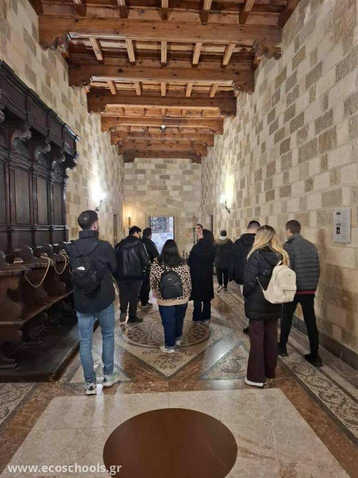 Μπαίνοντας στο Παλάτι, οι μαθητές/τριες εντυπωσιάστηκαν από την μεγαλοπρέπεια του κτηρίου, με τα επιβλητικά του τείχη και τα διακοσμητικά στοιχεία που αποπνέουν την ατμόσφαιρα του Μεσαίωνα. Η ξεναγός μας, η κα Μαργαρίτα, μας εξήγησε την ιστορική σημασία του Παλατιού, το οποίο αποτέλεσε έδρα των Ιπποτών του Τάγματος του Αγίου Ιωάννη και κέντρο διοίκησης κατά την εποχή τους. Οι μαθητές/τριες έμαθαν για τις μάχες και τις πολιτικές εξελίξεις της εποχής, καθώς και για τη ζωή των Ιπποτών.