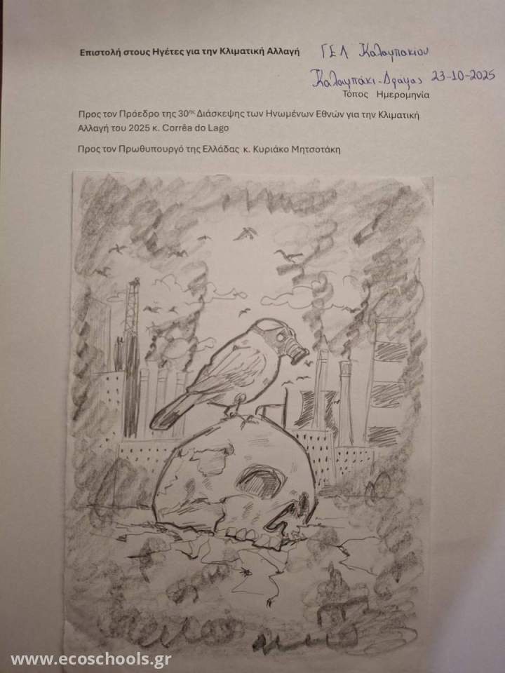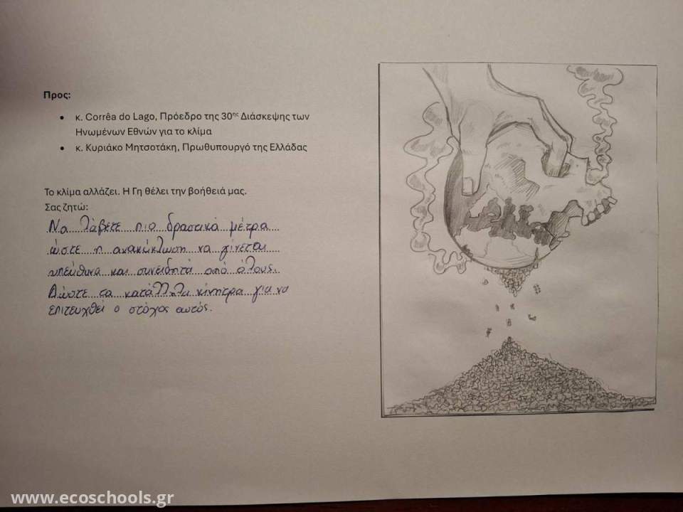[🎨] Τις επιστολές συνόδευσαν ζωγραφιές μαθήτριας της Α΄ Λυκείου, που απεικονίζουν τα προβλήματα που ήδη βιώνουμε λόγω της κλιματικής κρίσης – εικόνες που συγκινούν, προβληματίζουν και μας υπενθυμίζουν την ευθύνη όλων μας απέναντι στη Γη.