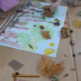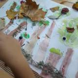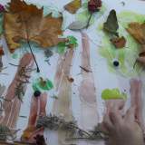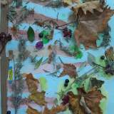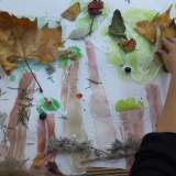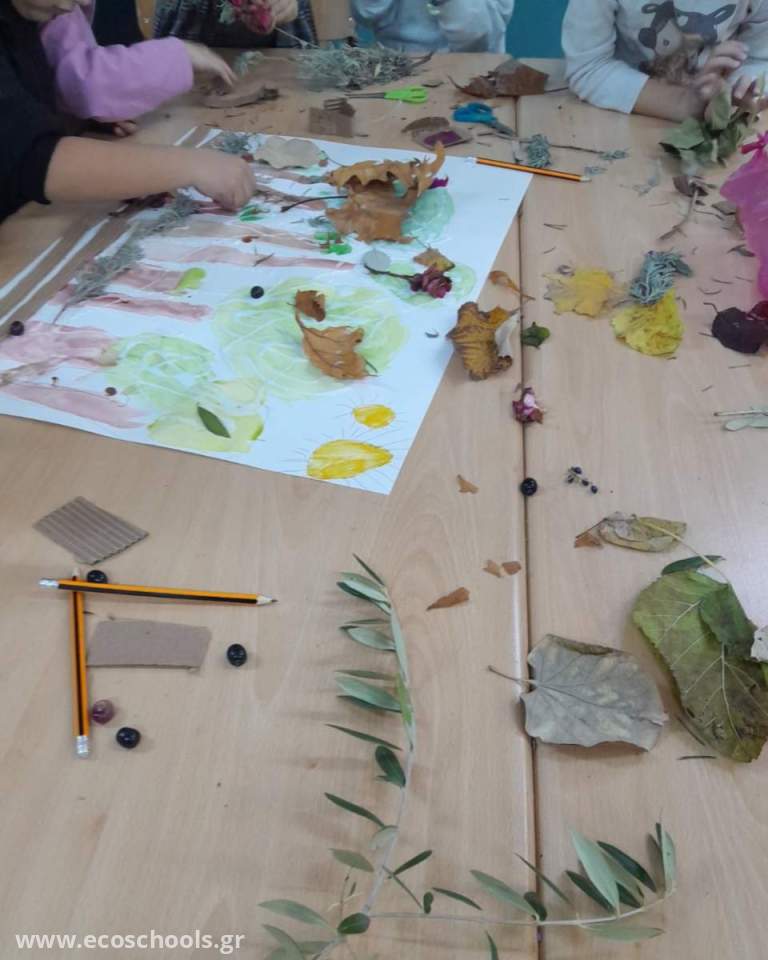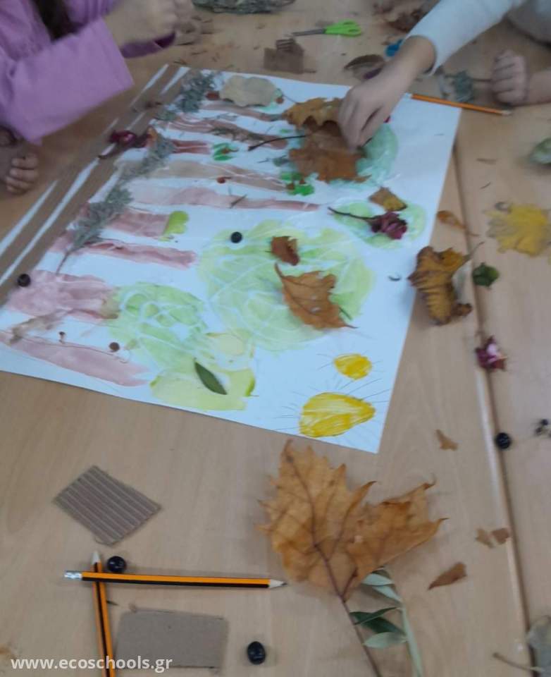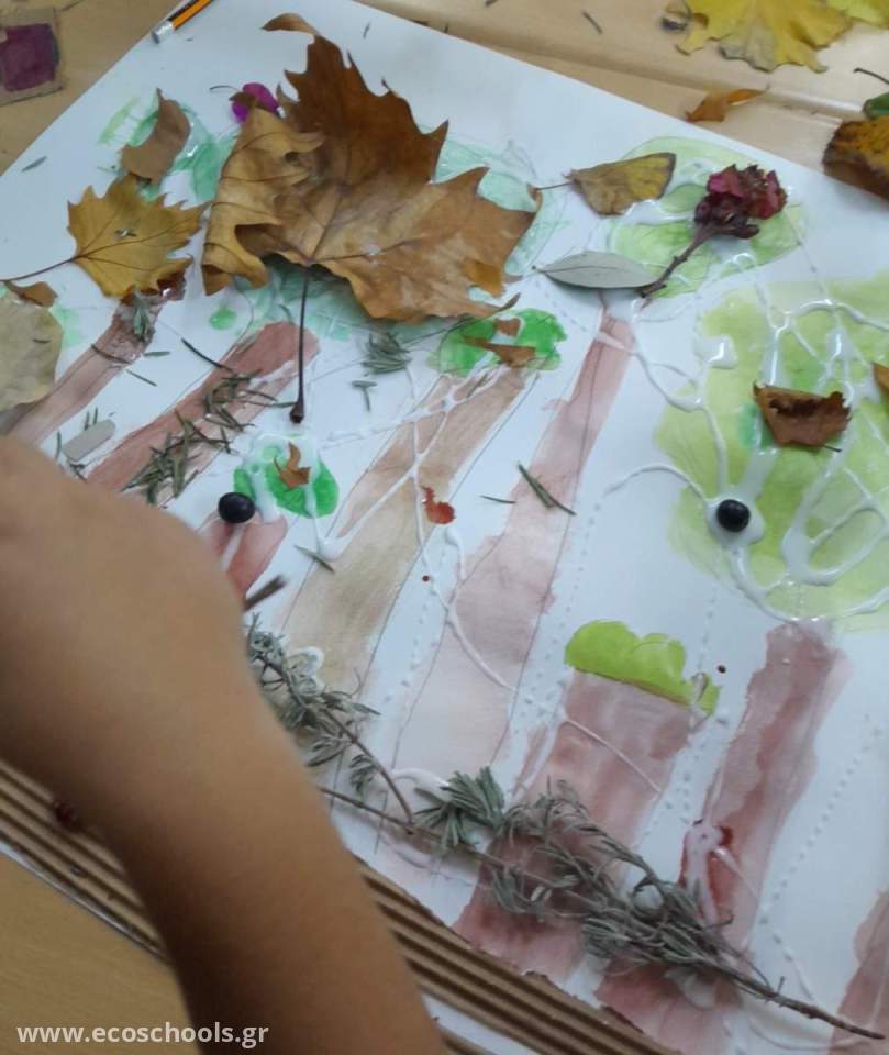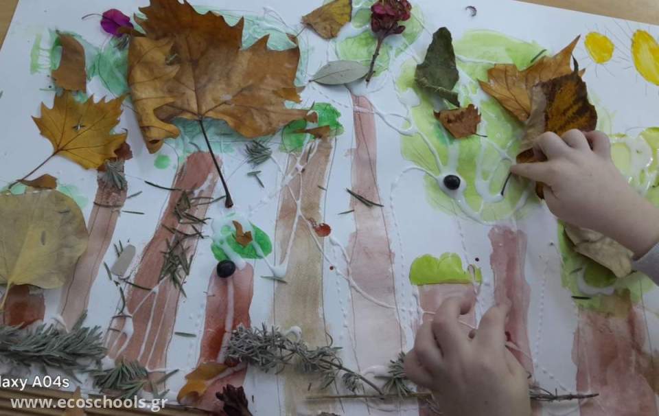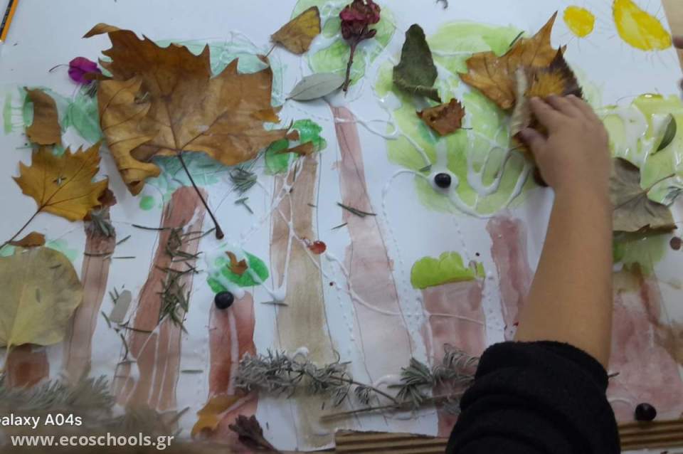 Φθινοπωρινό δάσος από τα παιδιά της πρώτης δημοτικού. φύλλα που μάζεψαν από την αυλή του σχολείου οι μικροί μαθητές και έφεραν την φύση μέσα στην τάξη.
