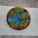 Μεταφέραμε προσεκτικά τις φυτρωμένες φακές σε έναν δίσκο. Εκεί, ζωγραφίσαμε τους γαλάζιους ωκεανούς και, χρησιμοποιώντας τις πράσινες βλαστήσεις μας, συνθέσαμε τις πέντε ηπείρους: την Ευρώπη, την Ασία, την Αφρική, την Αμερική και την Ωκεανία.