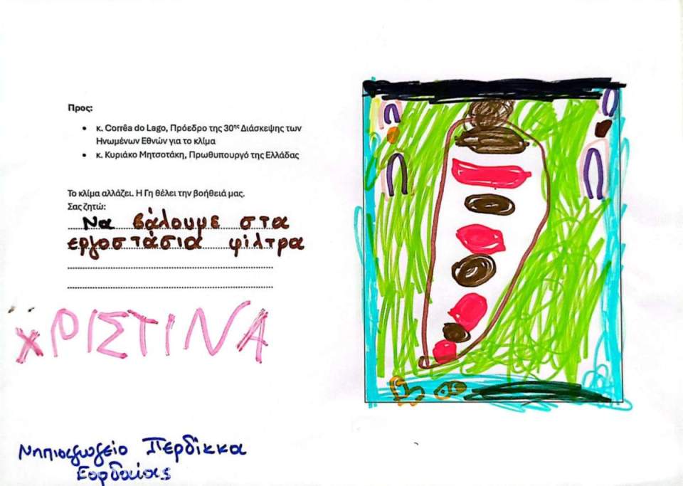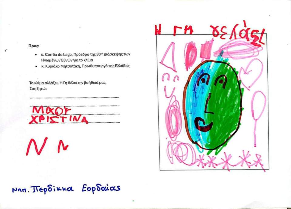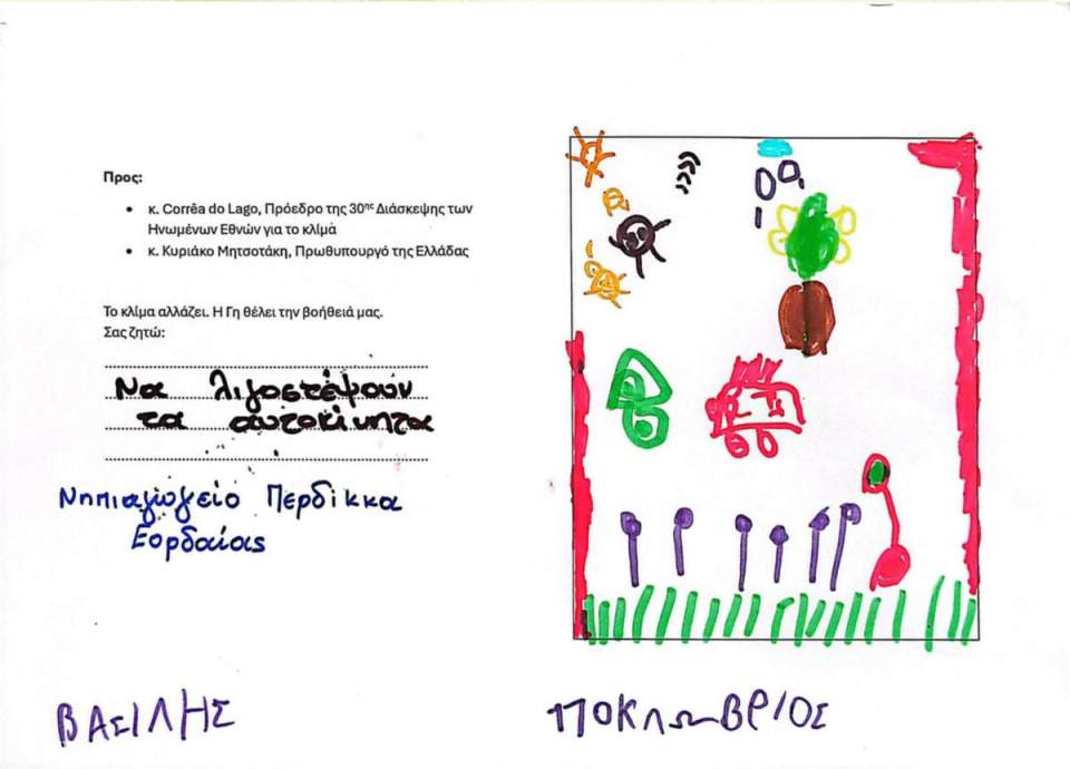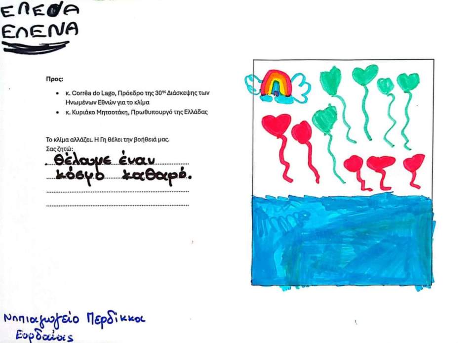 Οι μαθητές του Νηπιαγωγείου Περδίκκα εν όψει της COP 30 και μέσα από τις ζωγραφιές τους συμμετέχουν σε αυτή τη δράση, ενώνουν τις φωνές τους με τα παιδιά από τα άλλα σχολεία και στέλνουν τα μηνύματα τους στους παγκόσμιους ηγέτες, μηνύματα υπέρ της προστασίας των οικοσυστημάτων που θα εξασφαλίσουν τη βιωσιμότητα του πλανήτη.