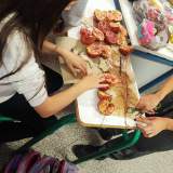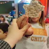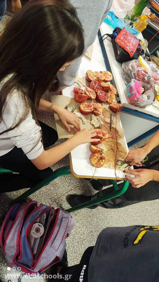 Στη συνέχεια, τα παιδιά πήραν ρόδια, τα έκοψαν στη μέση και τα πέρασαν πάνω στη γιρλάντα. Πάνω στην ίδια γιρλάντα τοποθέτησαν και ριζογκοφρέτες, τις οποίες είχαν προηγουμένως κόψει με κουπ-ατ σε σχήμα αστεριού, δημιουργώντας ακόμη περισσότερες φαγώσιμες και ελκυστικές εκπλήξεις για τα πουλιά. Οι γιορτινές, θρεπτικές γιρλάντες και τα στολίδια των παιδιών τοποθετήθηκαν στα δέντρα της σχολικής αυλής, προσφέροντας χαρά, τροφή και χρώμα στους φτερωτούς επισκέπτες μας, που τον χειμώνα δυσκολεύονται περισσότερο να βρουν τροφή.