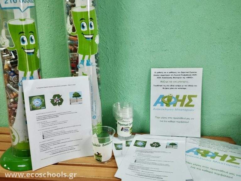 Την Παρασκευή 7 Νοεμβρίου υλοποιήθηκε ενημερωτική δράση στο σχολικό πλαίσιο προς τους μαθητές όλων των τάξεων για τη σημασία και την αξία της ανακύκλωσης μπαταριών και πλαστικών καπακιών, καθώς το σχολείο μας συμμετέχει ενεργά τη φετινή σχολική χρονιά στο πρόγραμμα Σχολικής Επιβράβευσης «ΑΦΗΣ» για την ανακύκλωση χρησιμοποιημένων μπαταριών, στοχεύοντας στην περαιτέρω μείωση του οικολογικού μας αποτυπώματος.Στο πλαίσιο αυτό, την Παρασκευή 14 Νοεμβρίου αντιπροσωπεία μαθητών και εκπαιδευτικών προχώρησαν σε πρακτικές ενέργειες, μοιράζοντας ενημερωτικά φυλλάδια, αφίσες και συλλέκτες για τη συγκέντρωση μπαταριών σε καταστήματα της τοπικής κοινωνίας επιδιώκοντας την ευαισθητοποίησή τους στο ζήτημα της ανακύκλωσης και τα αντίστοιχα οφέλη που απορρέουν από την όλη διαδικασία.