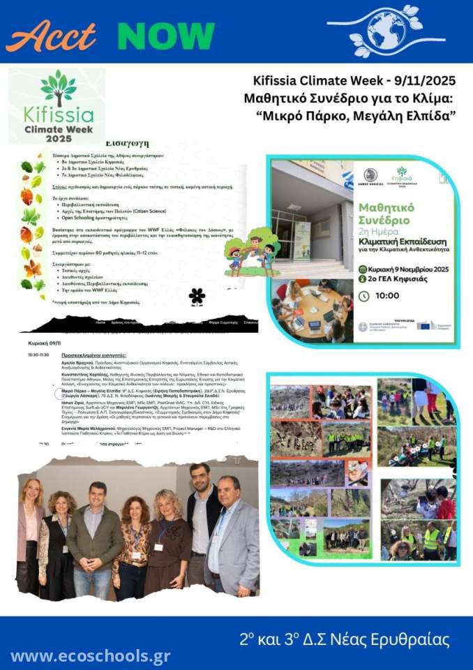 Στο πλαίσιο της Kifissia Climate Week, την Κυριακή 9 Νοεμβρίου, το 2ο & 3ο Δ. Σ. Ν. Ερυθραίας, το 8ο Δ. Σ. Κηφισιάς, , καθώς και το 7ο Δημοτικό Σχολείο Νέας Φιλαδέλφειας, συμμετείχαν στο Μαθητικό Συνέδριο για το Κλίμα, μια δράση συμμετοχής, έμπνευσης και ενεργού μάθησης, όπου παρουσιάστηκαν οι δράσεις δημιουργίας ενός Πάρκου Τσέπης στη γειτονιά μας από τους μαθητές και τις μαθήτριες μας..