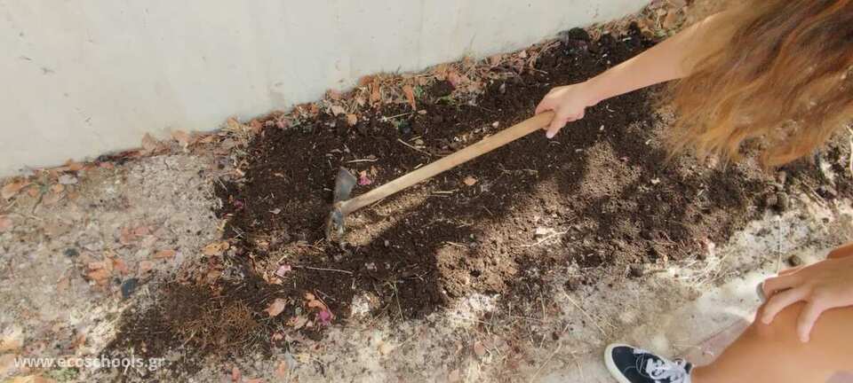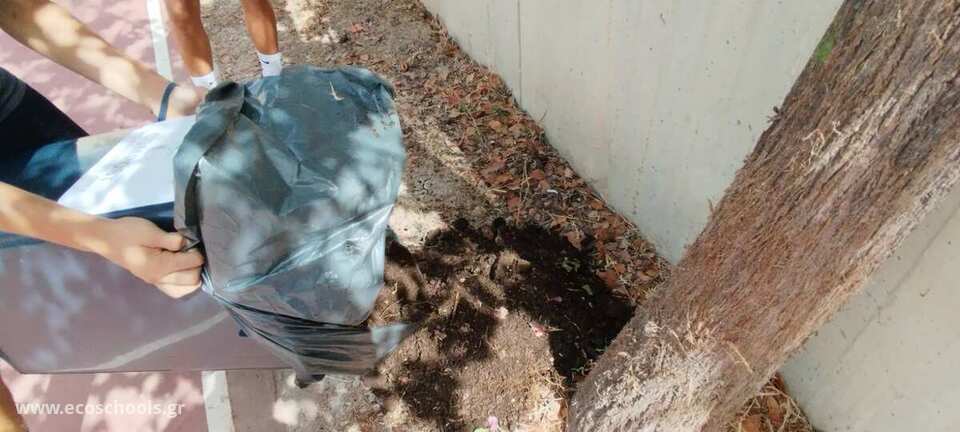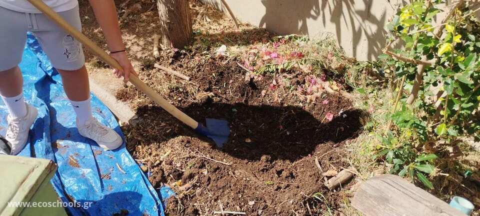 Στο πλαίσιο της περιβαλλοντικής μας δράσης, αξιοποιήσαμε το κομπόστ 200 lt που δημιουργήθηκε την προηγούμενη σχολική χρονιά από τα οργανικά υπολείμματα του σχολείου. Το πλούσιο σε θρεπτικά συστατικά χώμα χρησιμοποιήθηκε για τον εμπλουτισμό των παρτεριών μας, ενισχύοντας την ανάπτυξη των φυτών και δίνοντας νέο χρώμα και ζωντάνια στον σχολικό μας χώρο. Με αυτόν τον τρόπο, αποδείξαμε στην πράξη ότι η κομποστοποίηση δεν είναι μόνο μια διαδικασία ανακύκλωσης, αλλά και ένας κύκλος ζωής που επιστρέφει στο περιβάλλον ό,τι του ανήκει. Παράλληλα, προετοιμάσαμε εκ νέου τον κομποστοποιητή, ώστε η δράση να συνεχιστεί και τη φετινή χρονιά