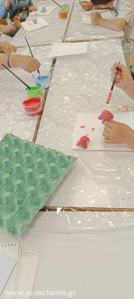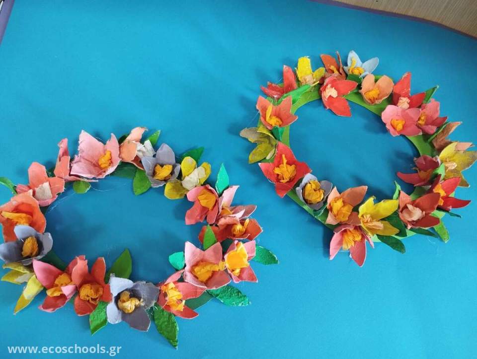 Η επιθυμία των παιδιών να στολίσουν με στεφάνια τις πόρτες των αιθουσών του σχολείου , ήταν το έναυσμα στο να τους παροτρύνουμε να φέρουν αυγοθήκες από τα σπίτια τους, να κόψουν, να βάψουν, να κολλήσουν και να δημιουργήσουν έργα τέχνης με το δικό τους μοναδικό τρόπο.