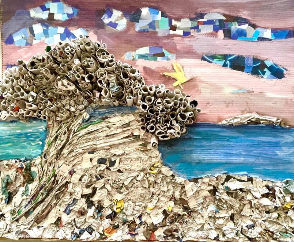 Αυτή η προσέγγιση μικτών τεχνικών μάς επιτρέπει να εξερευνήσουμε την πολύπλευρη σχέση μεταξύ της ανθρωπότητας και της θάλασσας. Το άκαμπτο χαρτόνι μιλά για την εξάρτησή μας από αυτήν για μεταφορά και πόρους.