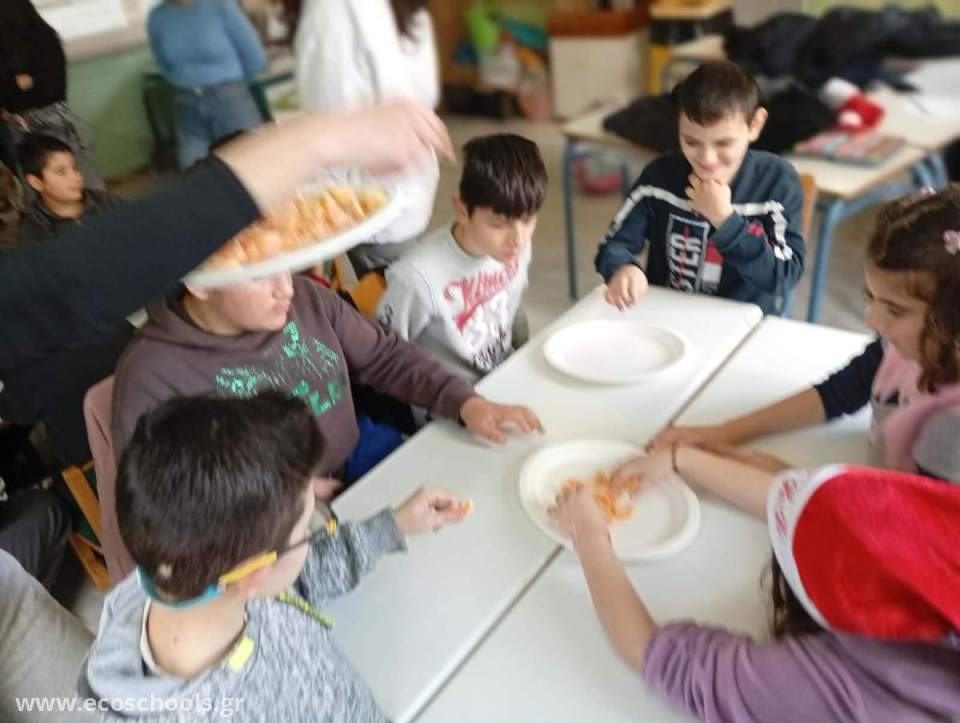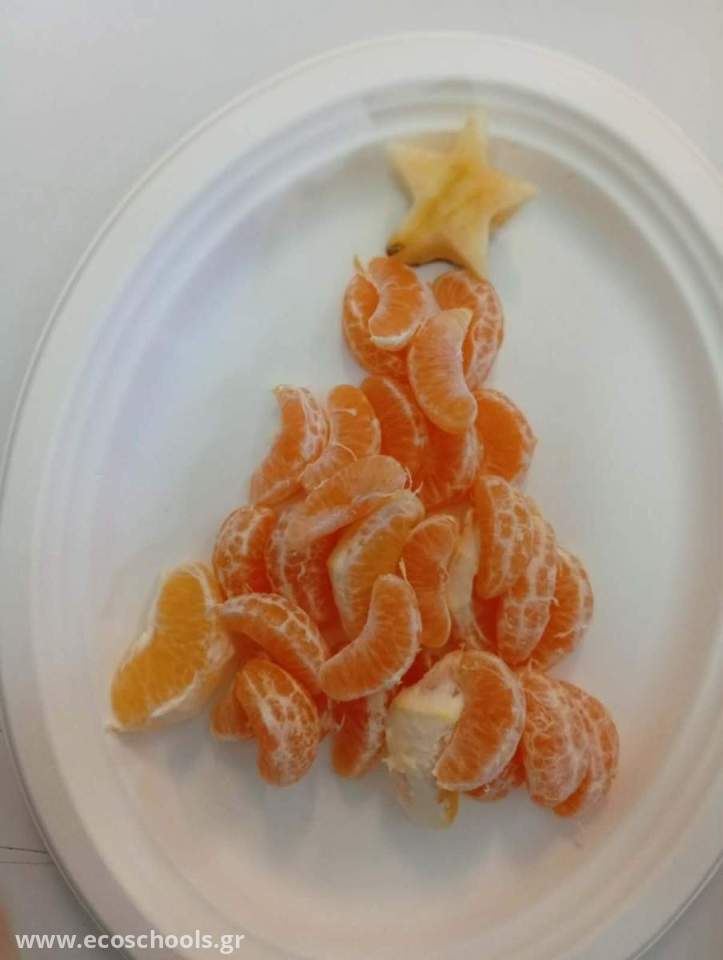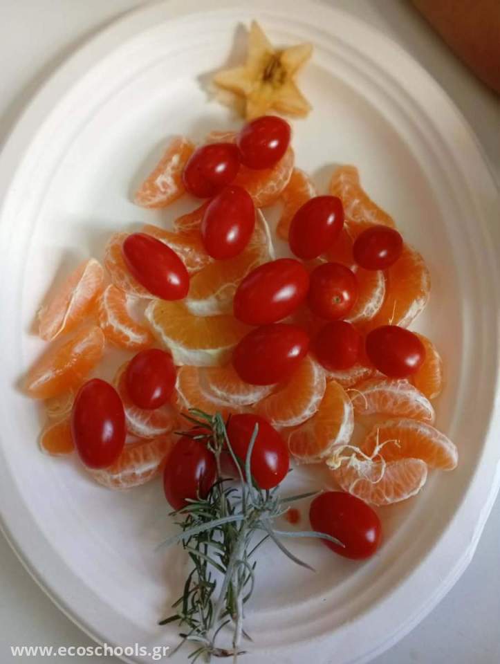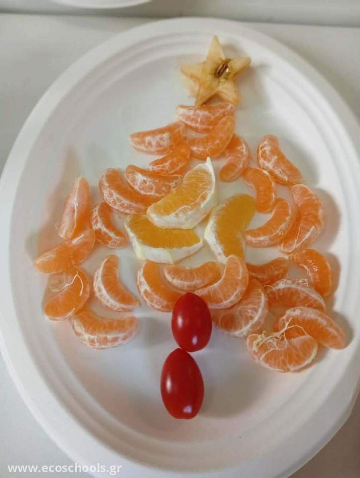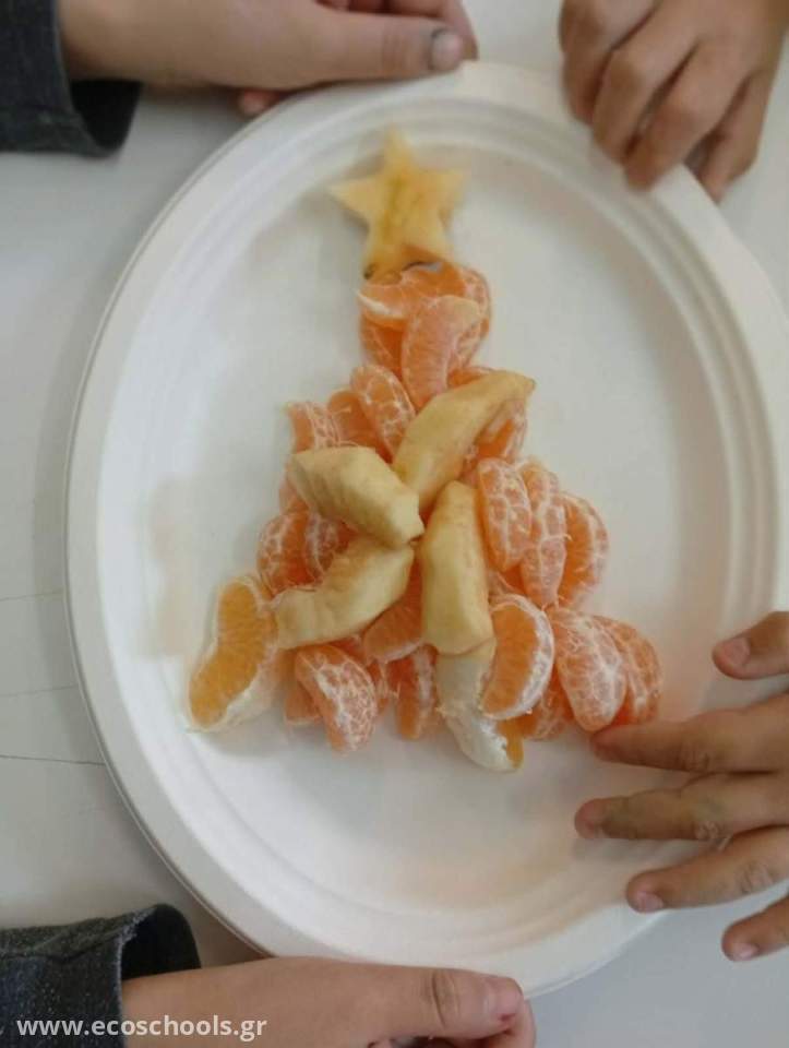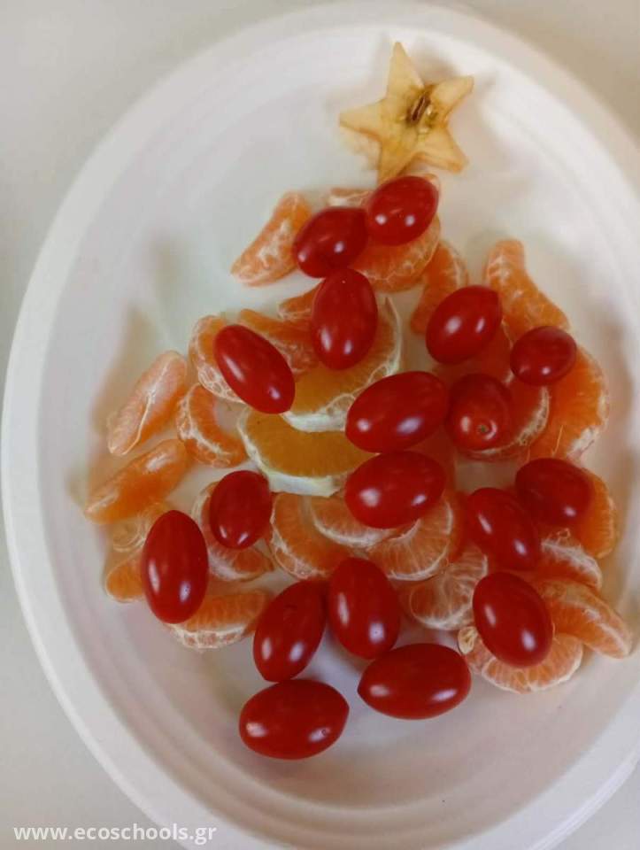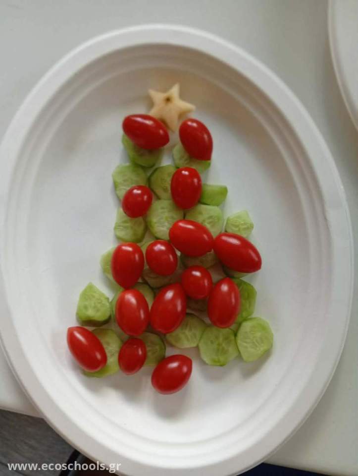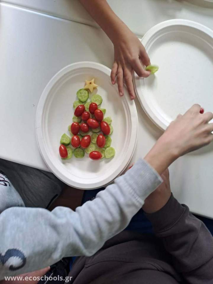 Στο πλαίσιο της εβδομάδας των χριστουγεννιάτικων δράσεων του σχολείου μας, υλοποιήθηκε μια πρωτότυπη και εναλλακτική βιωματική δράση, κατά την οποία οι μαθητές δημιούργησαν χριστουγεννιάτικα δέντρα χρησιμοποιώντας φρούτα και λαχανικά εποχής.