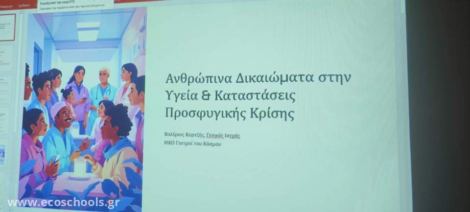Ο κ. Κορτζής μίλησε στους μαθητές μας για τις προκλήσεις υγείας που αντιμετωπίζουν οι πρόσφυγες, αναδεικνύοντας τη σημασία της ισότιμης πρόσβασης όλων των ανθρώπων σε υπηρεσίες υγείας, ανεξαρτήτως εθνικότητας ή κοινωνικής κατάστασης. Μέσα από παραδείγματα και εμπειρίες της επαγγελματικής του πορείας, βοήθησε τους μαθητές να κατανοήσουν καλύτερα τις δυσκολίες που αντιμετωπίζουν οι ευάλωτες κοινωνικές ομάδες και τον ρόλο που μπορεί να παίξει η ιατρική, αλλά και η κοινωνία συνολικά, στην υποστήριξή τους.
